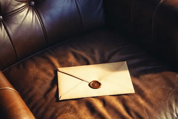 Thick kraft envelope. Burgundy wax seal. Delivered to your door once a month.